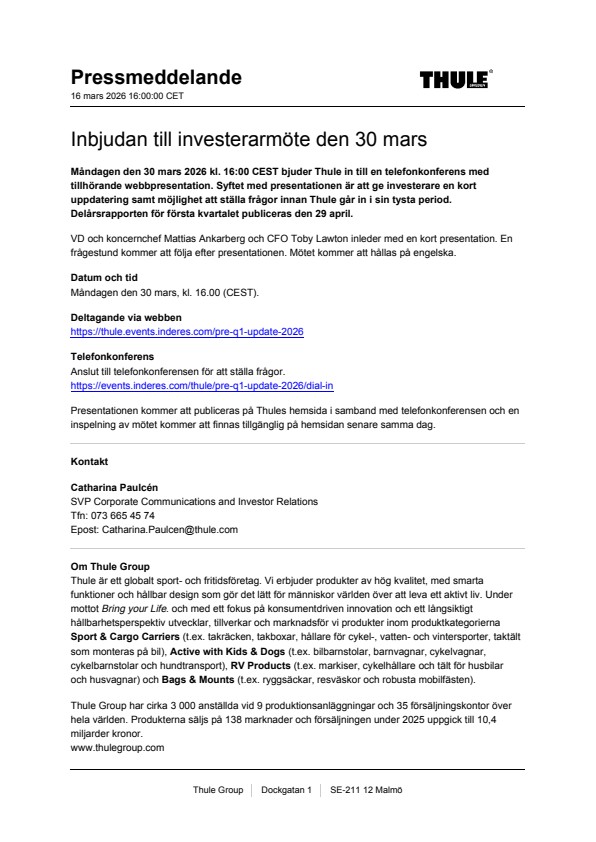 Måndagen den 30 mars 2026 kl. 16:00 CEST bjuder Thule in till en telefonkonferens med tillhörande webbpresentation. Syftet med presentationen är att ge investerare en kort uppdatering samt möjlighet att ställa frågor innan Thule går in i sin tysta period. Delårsrapporten för första kvartalet publiceras den 29 april.