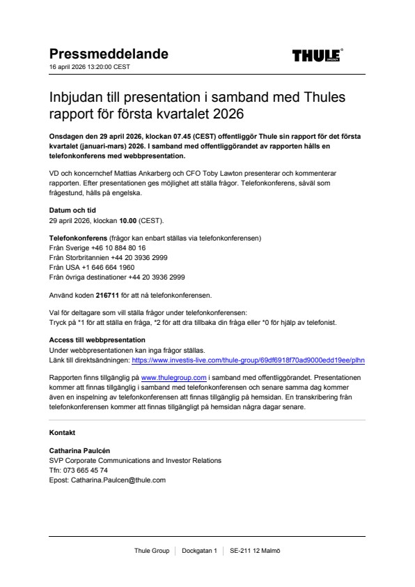 Länk till direktsändningen: https://www.investis-live.com/thule-group/69df6918f70ad9000edd19ee/plhn