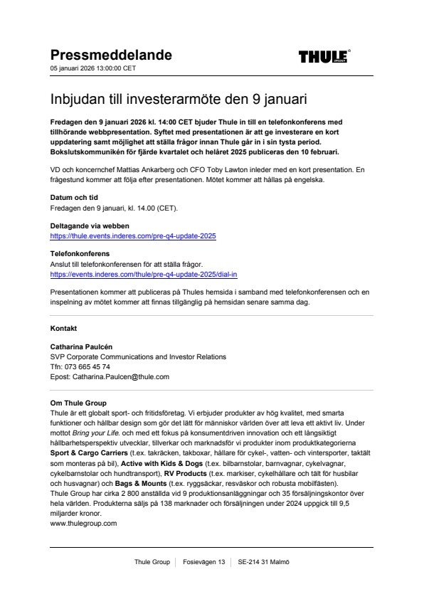 Fredagen den 9 januari 2026 kl. 14:00 CET bjuder Thule in till en telefonkonferens med tillhörande webbpresentation. Syftet med presentationen är att ge investerare en kort uppdatering samt möjlighet att ställa frågor innan Thule går in i sin tysta period. Bokslutskommunikén för fjärde kvartalet och helåret 2025 publiceras den 10 februari.