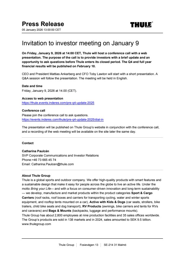 On Friday, January 9, 2026 at 14:00 CET, Thule will host a conference call with a web presentation. The purpose of the call is to provide investors with a brief update and an opportunity to ask questions before Thule enters its closed period. The Q4 and full year financial results will be published on February 10.