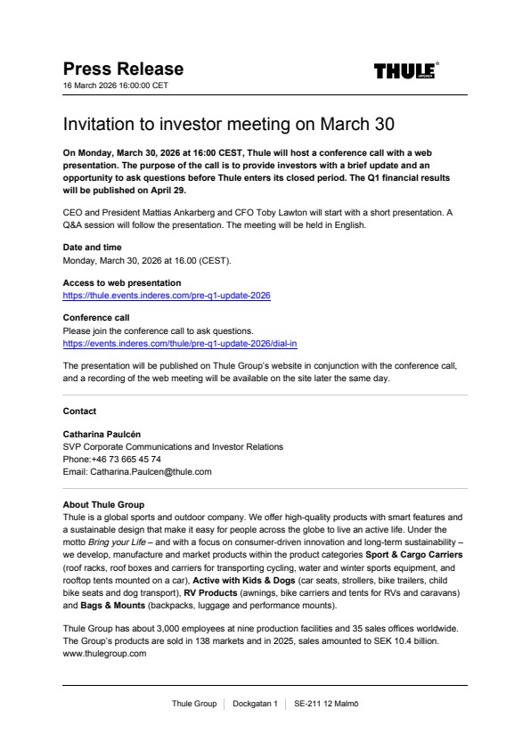 On Monday, March 30, 2026 at 16:00 CEST, Thule will host a conference call with a web presentation. The purpose of the call is to provide investors with a brief update and an opportunity to ask questions before Thule enters its closed period. The Q1 financial results will be published on April 29.