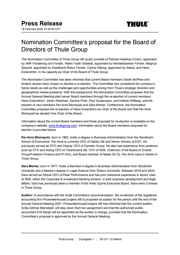 The Nomination Committee of Thule Group AB (publ) consists of Patricia Hedelius (Chair), appointed by AMF Försäkring och Fonder, Helen Fasth Gillstedt, appointed by Handelsbanken Fonder, Magnus Sjöqvist, appointed by Swedbank Robur Fonder, Carina Silberg, appointed by Alecta, and Hans Eckerström, in his capacity as Chair of the Board of Thule Group.