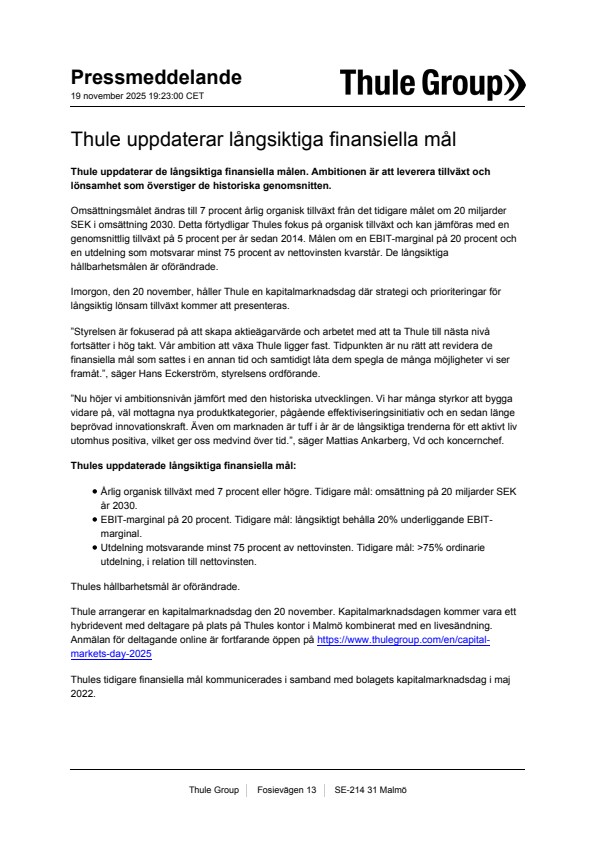 Thule arrangerar en kapitalmarknadsdag den 20 november. Kapitalmarknadsdagen kommer vara ett hybridevent med deltagare på plats på Thules kontor i Malmö kombinerat med en livesändning. Anmälan för deltagande online är fortfarande öppen på https://www.thulegroup.com/en/capital-markets-day-2025