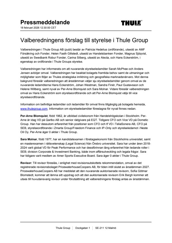 Valberedningen i Thule Group AB (publ) består av Patricia Hedelius (ordförande), utsedd av AMF Försäkring och Fonder, Helen Fasth Gillstedt, utsedd av Handelsbanken Fonder, Magnus Sjöqvist, utsedd av Swedbank Robur Fonder, Carina Silberg, utsedd av Alecta, och Hans Eckerström, i egenskap av ordförande i Thule Groups styrelse.